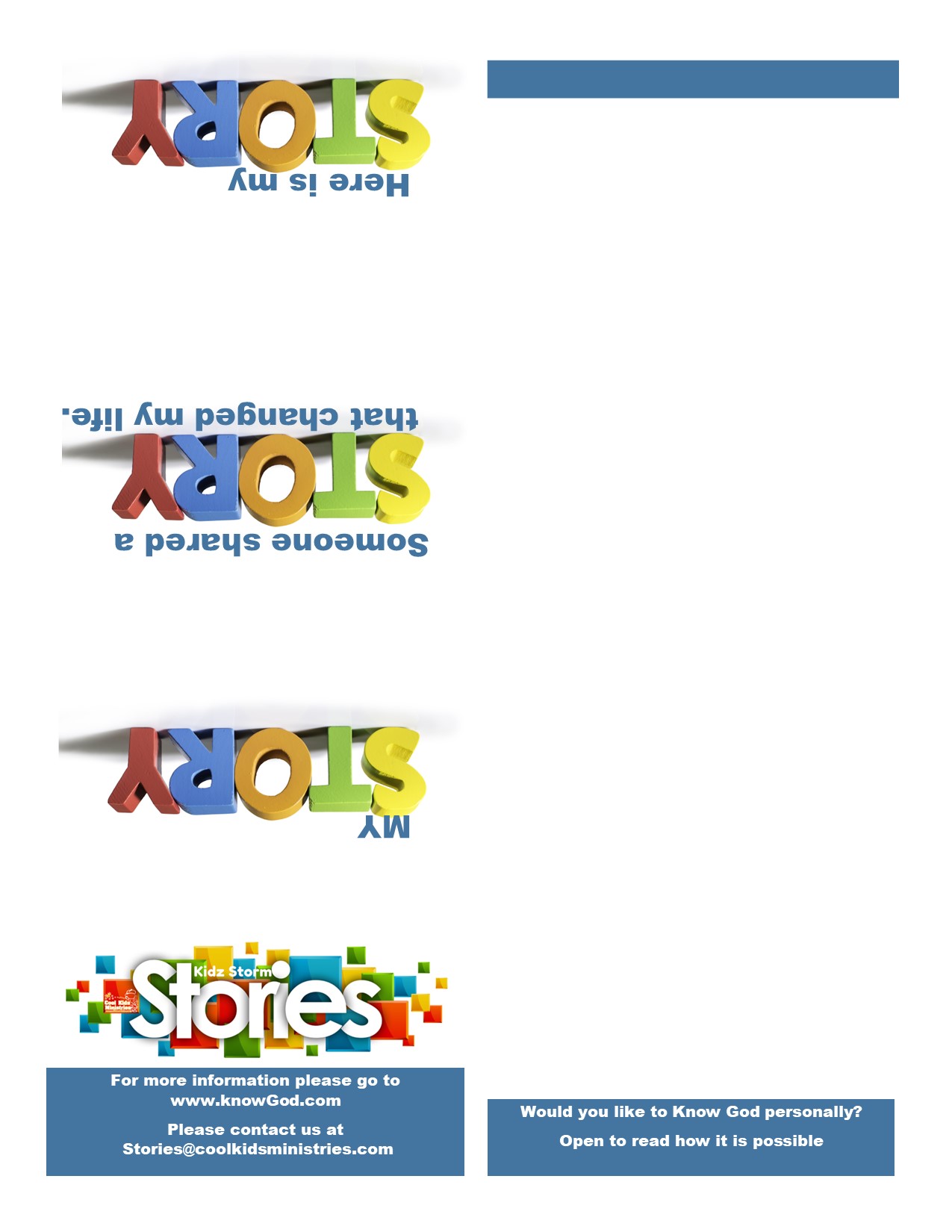IIf you are unable to use the form above please email your story to This email address is being protected from spambots. You need JavaScript enabled to view it. we will type it up for you and send you a jpeg and a pdf that you can print or take to any office supply and have them print as many as you like. Just click below to email us your story and we will get you on your way! In order to fold your story tract correctly look at the pictures or watch the video below.