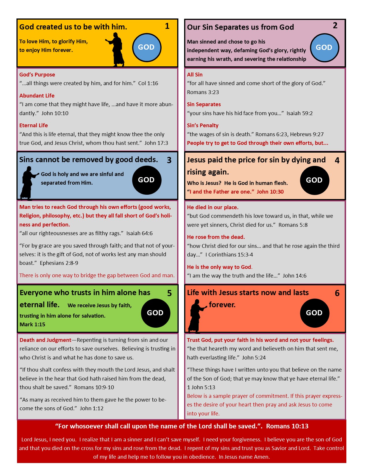 Everyone has a story. It is unique to you and you only. In John 4:3-30 Jesus tells us the story of "The Woman at the Well." She had a very unique story as well as a very unique life. It is interesting to note that the Bible says of Jesus, he "must needs go through Samaria." This was not the quickest way to get to Galilee, but it was the way he needed to go to meet this woman. She had a story to tell and someone needed to hear her story and then give her a story that would change her life forever. It is amazing how Jesus can take one story and completely change it. He did that for me, and many many others and he can do that for you. Below you are going to find two jpegs that are going to help you to tell your story more efficiently and effectively than ever before. Here is all you need to do. Download the two pictures. Open page one in any desktop publishing program. Make it full page (portrait), edge to edge and then in the big blank area draw a textbox and type op your story. Keep the main things the main things. Don't get off into a lot of details but tell people how you came to know the Lord as your Savior. Don't use a lot of "Christianese." In other words, don't use a lot of church words that the lost world doesn't understand. Just tell your story. Now print off that page with your story, turn it over and print page two on the back of it (just as before, open it up in your program, portrait style, and print on the back of page one). Now fold in half, long ways, then in half again from top to bottom and then in half one more time an you will have a concise, personal, little tract with your story and then they can open it up and learn how they too can make Jesus Christ the Lord of their life and start sharing their own story with others. Check out the list below for suggestions on how to write your story!